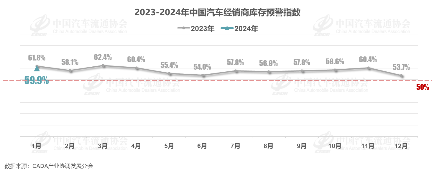 2024年1月31日,中國(guó)汽車(chē)流通協(xié)會(huì)發(fā)布的最新一期“中國(guó)汽車(chē)經(jīng)銷(xiāo)商庫(kù)存預(yù)警指數(shù)調(diào)查”VIA(Vehicle Inventory Alert Index)顯示,2024年1月中國(guó)汽車(chē)經(jīng)銷(xiāo)商庫(kù)存預(yù)警指數(shù)為59.9%,同比下降1.9個(gè)百分點(diǎn),環(huán)比上升6.8個(gè)百分點(diǎn)。庫(kù)存預(yù)警指數(shù)位于榮枯線之上,汽車(chē)流通行業(yè)處在不景氣區(qū)間,景氣度較上月有所回落。