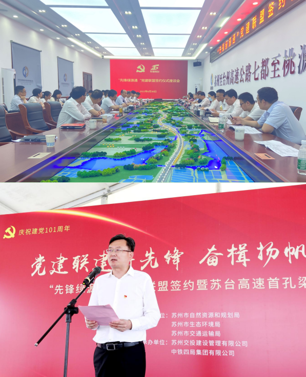 6月30日,蘇州市自然資源和規(guī)劃局、市生態(tài)環(huán)境局、市交通運(yùn)輸局聯(lián)合舉行“先鋒綠源通”黨建聯(lián)盟簽約暨蘇臺(tái)高速首孔梁架設(shè)儀式,旨在加強(qiáng)“三個(gè)表率”模范機(jī)關(guān)建設(shè),深入推進(jìn)黨建和業(yè)務(wù)深度融合,努力實(shí)現(xiàn)“1+1+1>3”的品牌效應(yīng),形成聯(lián)合共建、協(xié)同推進(jìn)綠色發(fā)展的良好態(tài)勢(shì)。