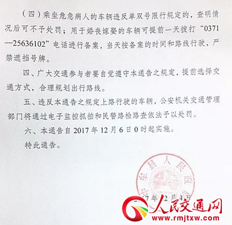 (四)乘坐危急病人的車輛違反單雙號限行規(guī)定的,查明情況后可不予處罰;用于婚喪嫁娶的車輛可提前一天撥打“0371—25636102”電話進(jìn)行備案,當(dāng)天按備案的時間和路線行駛,嚴(yán)禁遮擋號牌。