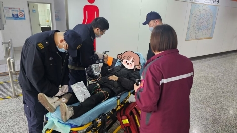 在等待120期間,甘曉聞不斷跟乘客講話,保持乘客的意識(shí)清醒,車站民警也及時(shí)聯(lián)系了乘客家屬。 乘客同時(shí)也出現(xiàn)上吐下瀉的情況,車站立即用輪椅將乘客推送至站廳無(wú)障礙廁所。9:13分被派去接應(yīng)救護(hù)車的員工也帶著120趕赴了現(xiàn)場(chǎng),經(jīng)過一系列的檢查后,決定將乘客送往中山醫(yī)院救治。在此期間,該乘客的情況也逐漸穩(wěn)定下來(lái),甘曉聞也與乘客家屬聯(lián)系,告知120已將家屬送往中山醫(yī)院,家屬可直接前往醫(yī)院,家屬不停對(duì)工作人員表示感謝。
