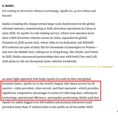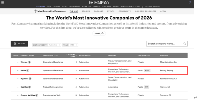 3月24日,全球權(quán)威商業(yè)媒體《Fast Company》發(fā)布2026年“最具創(chuàng)新力企業(yè)”榜單。百度憑借蘿卜快跑(Apollo Go)入選Automotive類別全球第二,成為唯一進(jìn)入該榜單前三的中國(guó)企業(yè),凸顯中國(guó)在無(wú)人駕駛領(lǐng)域的全球競(jìng)爭(zhēng)力。