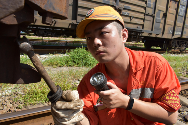 檢車員魏梓健檢查車輛車鉤部位技術(shù)狀態(tài)。