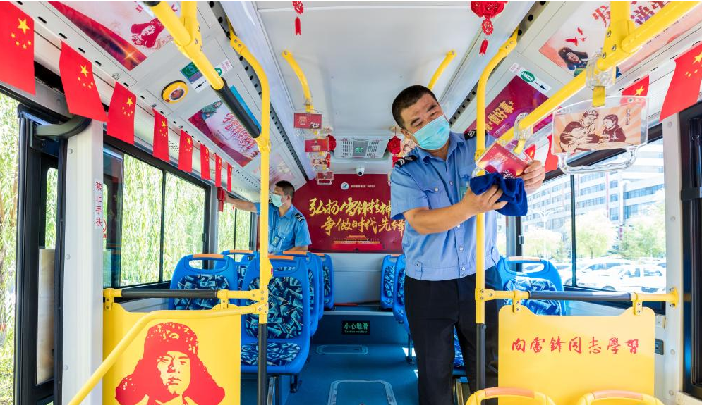 2020年8月11日,內(nèi)蒙古呼和浩特市,駕駛員秦廣恒(右一)、閆長(zhǎng)春在“雷鋒精神”主題公交車上擦拭整理車廂的內(nèi)部衛(wèi)生。近日,內(nèi)蒙古呼和浩特市公交總公司第三公司車隊(duì)第二黨支部在66路419號(hào)、421號(hào)公交車上打造了“雷鋒精神”主題車廂,用雷鋒畫像、雷鋒事跡、向雷鋒同志學(xué)習(xí)語(yǔ)錄等貼畫裝飾車廂,供乘客閱讀欣賞,倡導(dǎo)乘客文明乘車,使公交車成為市民學(xué)習(xí)雷鋒精神的“流動(dòng)課堂”。